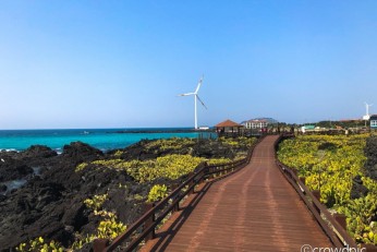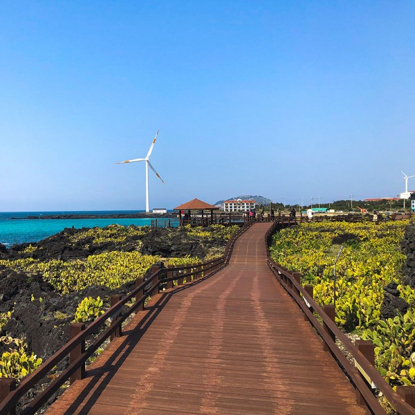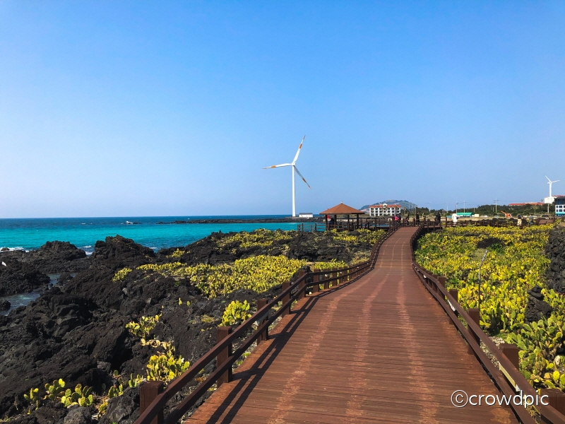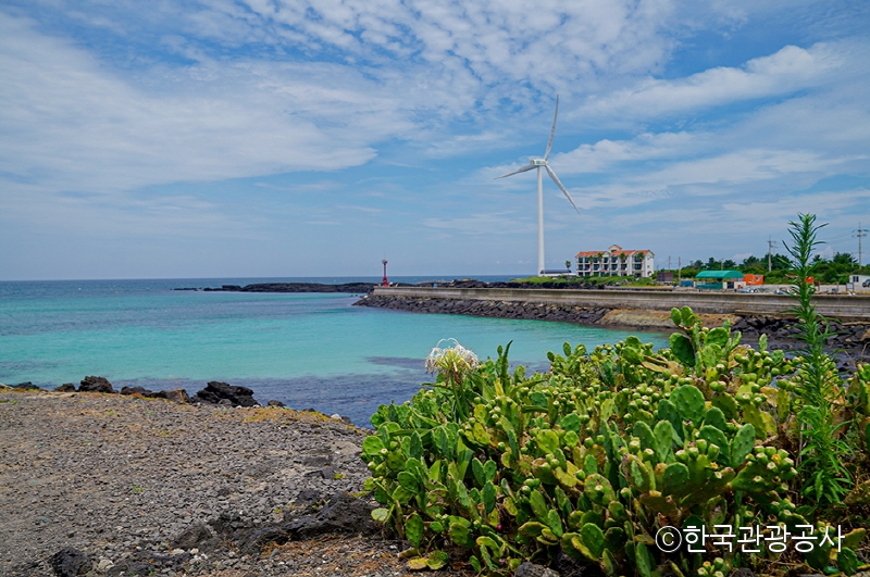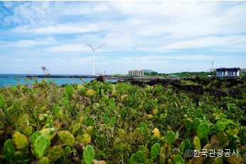 산책하기 좋은 제주 명소 월령리 바다의 선인장은 제주도에서 자생한 것이 아니라 덥고 건조한 지역의 선인장 열매가 해류를 따라 월령리 바닷가에 정착하여 야생으로 군락을 이룬 것으로 약 5,000㎡ 규모에 자생하고 있다. 이곳의 선인장은 멕시코가 원산지이며 형태가 손바닥 모양과 같아서 "손바닥 선인장"이라고 부른다. 특히 바다 한가운데에 있는 커다란 풍력발전기와 까만 돌 틈 사이로 자란 선인장은 발걸음을 멈추게 하는 이국적인 분위기로 사람을 매료시킨다. 월령리 선인장 군락지는 해안선을 중심으로 나무 데크가 놓여 있어 보행하기에 수월한 편이다. 산책로가 끝날 즈음이면 마을 안으로 들어서는 골목길이 이어진다. 골목길의 검은 현무암 돌담 위로 선인장들이 얼굴을 내밀고 있다. 특히 6월이면 노란색 선인장꽃이 검은 현무암과 대비를 이루어 장관을 연출하기도 한다.